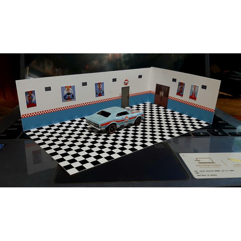 Printable retro diorama garage display 1/18 scale. Papercraft diorama mechanics racing skala 64 diorama garage.